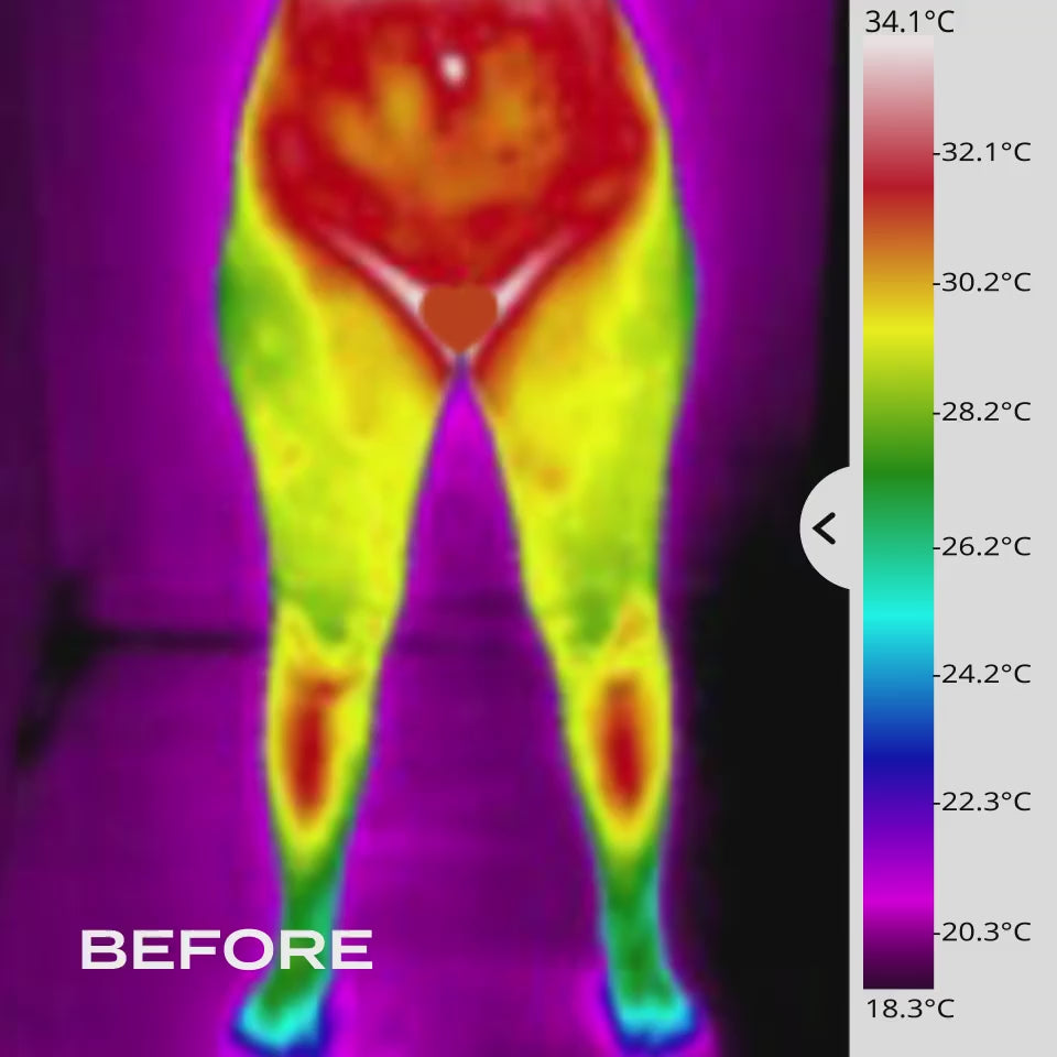 In a 2023 clinical study, digital infrared thermal imaging - a safe alternative to mammograms - showcased Elastique's impressive impact on lymphatic circulation.Test subjects wore L'Original Leggings for 8-10 days, for 3-6 hours each day.The results? Improved lymphatic flow,with 'before' readings showing congestionand 'after' readings indicating enhanced circulation in the legs and buttocks.
